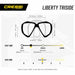 Explore the underwater world with the Diving Silicone Mask Liberty Triside by Cressi, designed for ultimate comfort and exceptional visibility. This advanced mask features a three-lens panoramic design built with a wide mono front lens and two-sided lenses, ensuring an uninterrupted panoramic view that feels as open as the ocean itself. Crafted from durable materials, its lightweight polycarbonate frame is complemented by a soft, hypoallergenic silicone skirt that guarantees a perfect seal and fit for a wide range of face shapes. The tempered glass lenses provide clarity and are engineered to maximize light intake, enhancing your underwater experience. With easy-to-adjust ratcheting strap buckles, which can be operated even while wearing gloves, the mask combines convenience with cutting-edge design, making it ideal for recreational and professional divers alike.